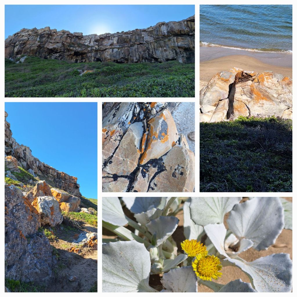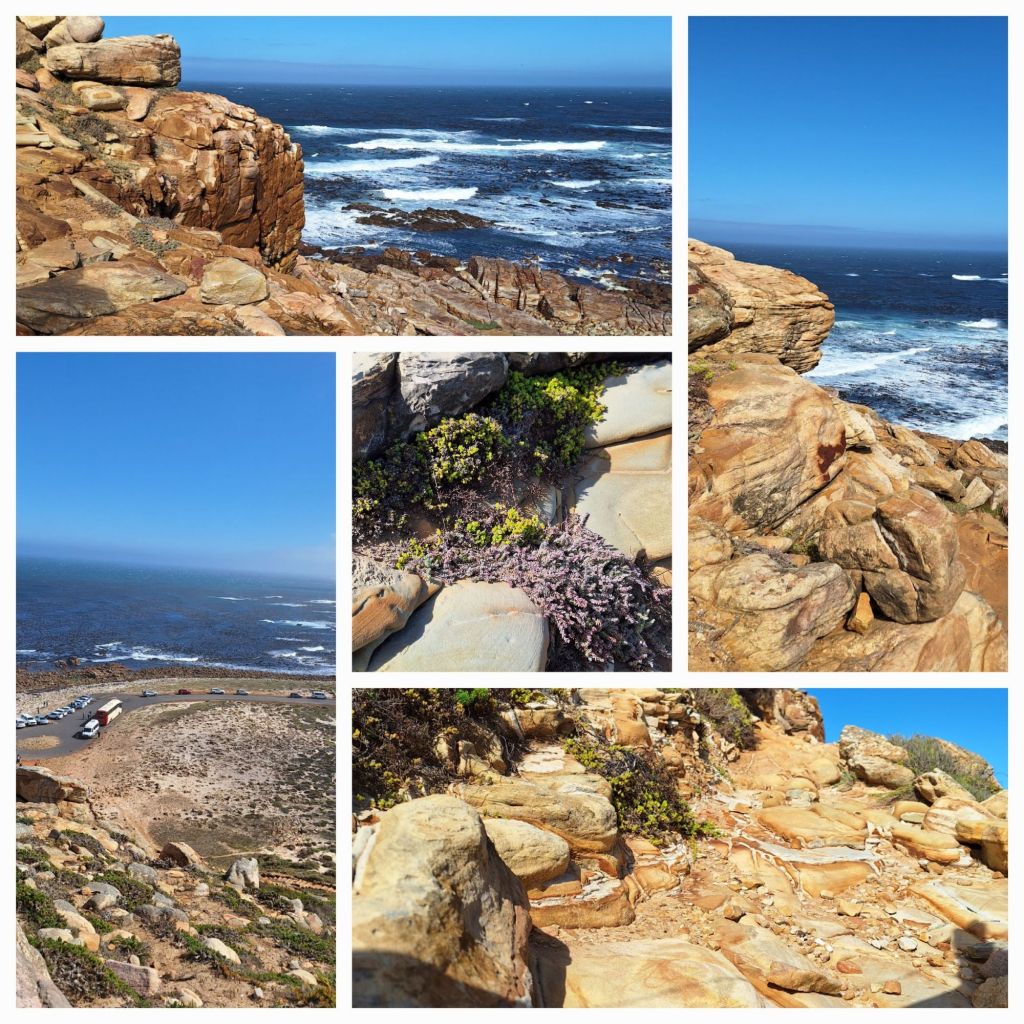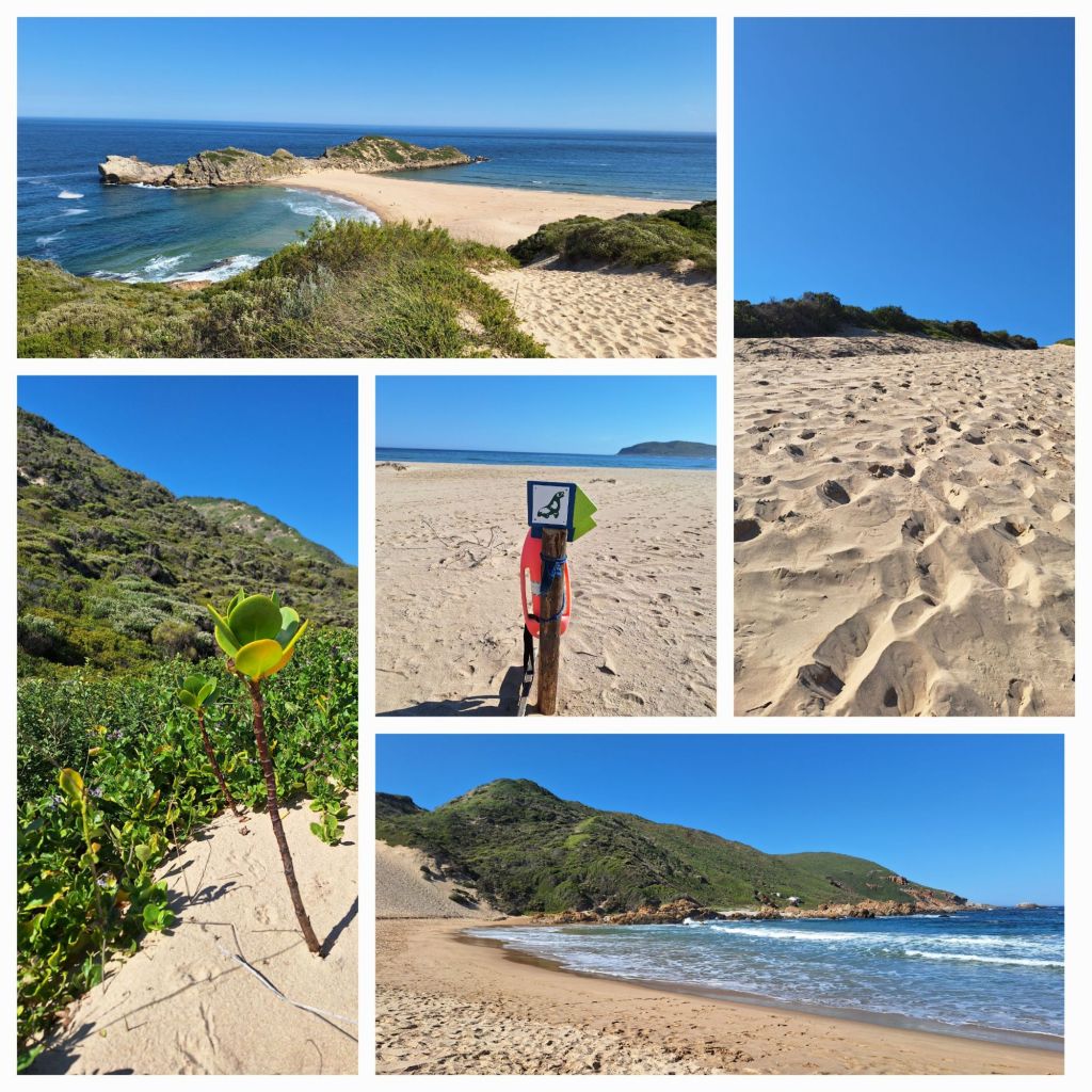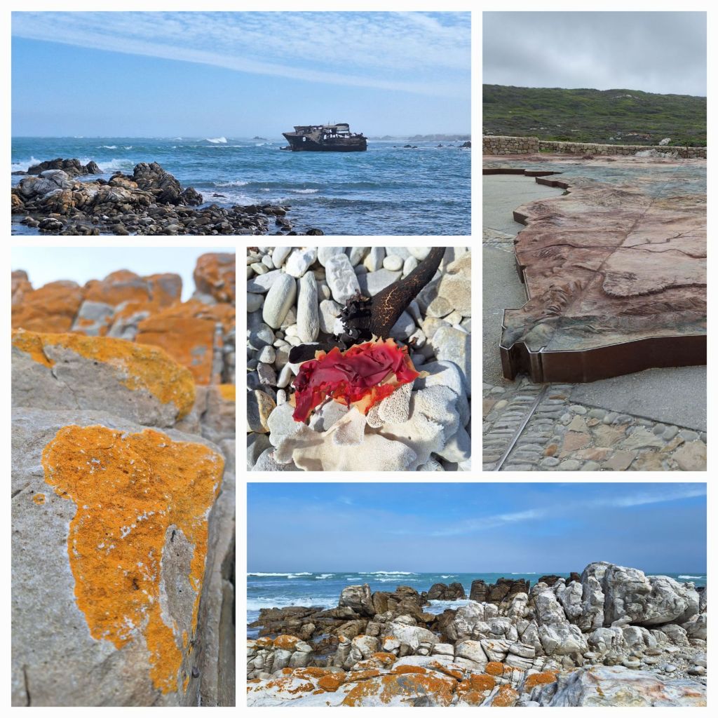 Um 10:30 Uhr passieren wir das OrtseingangsschildUnd fast sofort sind wir am Strand begeistert beim Muschelsuchen und Schätze finden.Vorm Leuchtturm der Eingang zum NP mit besonderem Warnschild, nach 1.5 km sind wir am Southern Tip (u.l.)Ein toller Platz für die Mittagspause am Southern Tip – dann weiter zum Wrack (o.l.)Unser Rückweg, als kleine Verlängerung der Route laufen wir auch das Cape Agulhas15:30 Uhr passieren wir erneut das Ortseingangsschild, (o.r.) die letzten Meter die Klippe nach oben. Blick auf ‚unseren‘ Strand.