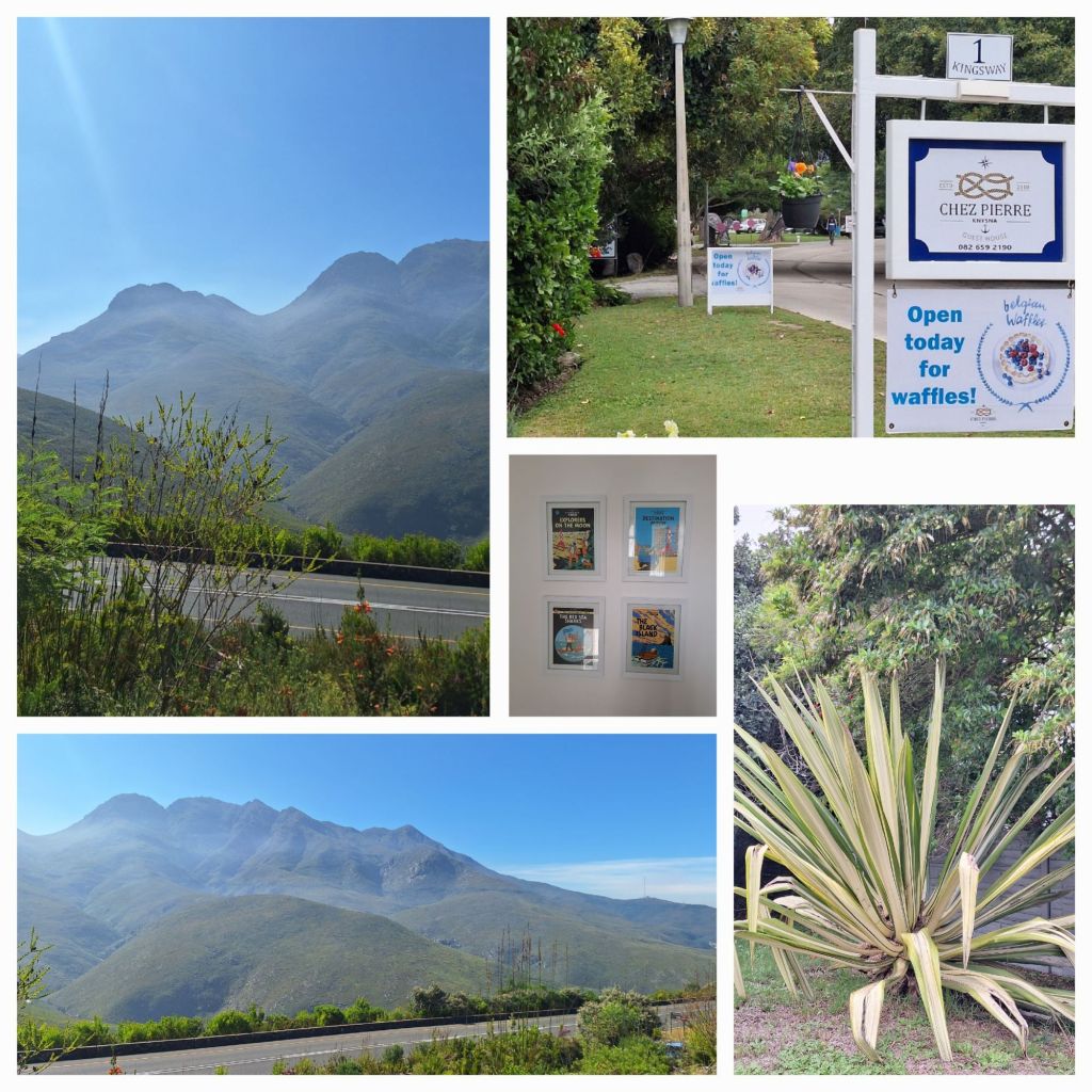Das Le Roux von außen, Strassencafé und Strassenszene gegenüber, der Pass auf der Rückfahrt Richtung George/Wilderness