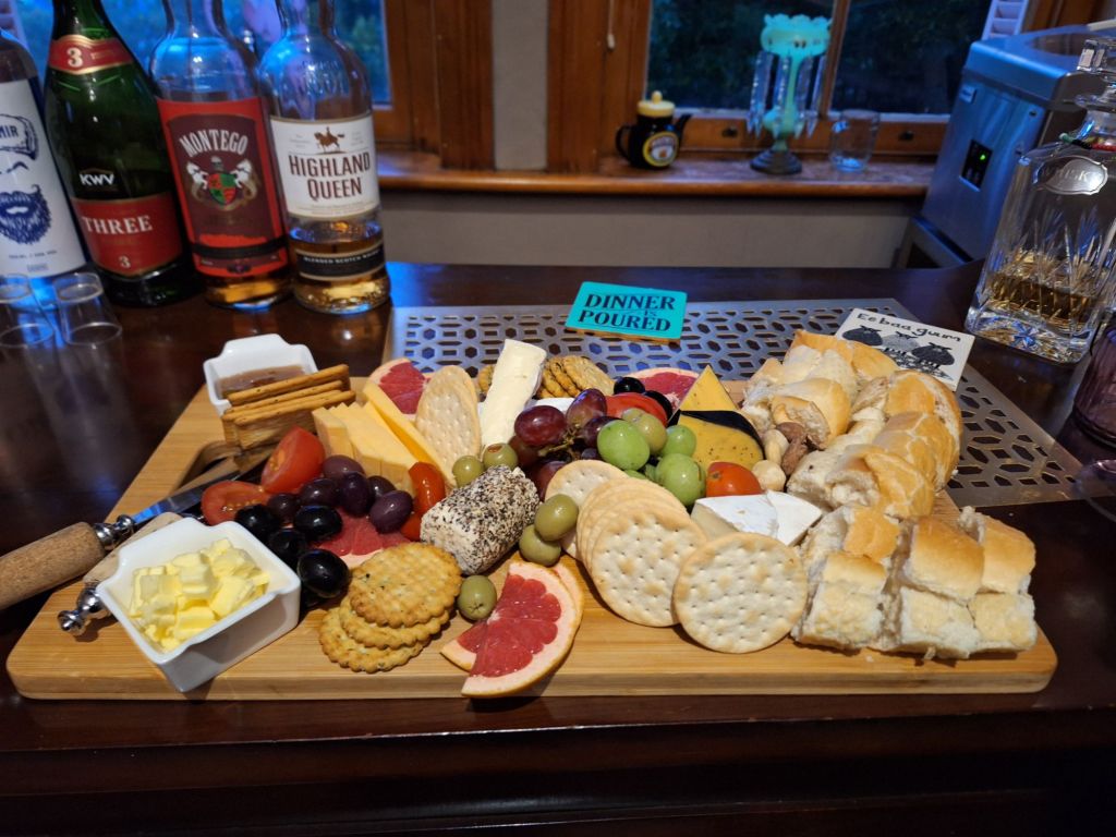 In Mossel Bay Nieselregen. Aber Bettys Boutique Hotel ist eine Wucht. Das Haus wurde 1903 erbaut und von den jetzigen Eigentümern, einer Familie aus Yorkshire, in 2017 erworben. Alles sehr englisch! Wir Essen eine vorbestellte Käseplatte zu Abend, trinken leckeren Weißwein und spielen eine Runde Billard.