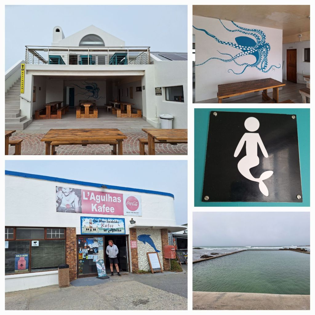 Oben links das Fischrestaurant mit Takeaway (war unser Ziel), Tankstelle/Tante Emma-Laden in direkter Nachbarschaft. Naturschwimmbad in L’Agulhas