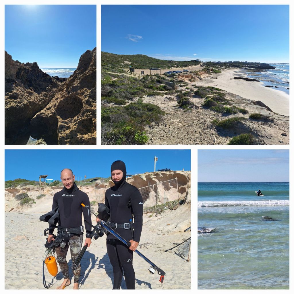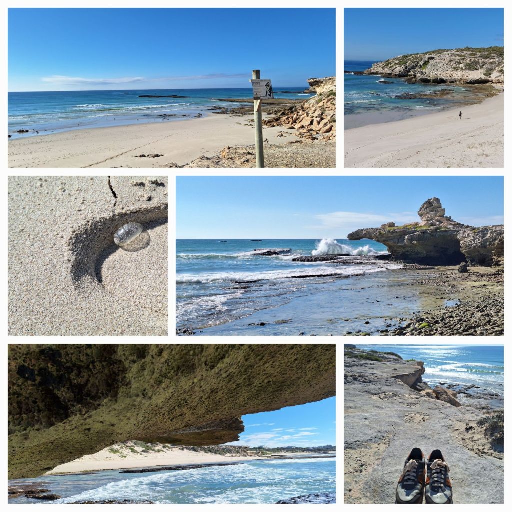 Früh, aber nicht früh genug – jedenfalls für meine Schuhe. Toller Strand in Arniston. Seestachelbeere – eine Quallenart (Mitte l.)Die Taucher sind mit ihren Harpunen auf der Jagd nach Muschelbeissern – nicht wirklich hübsche, aber ziemlich grosse Fische.Aufnahmen in Arniston, bis auf o.r., diese Häuser stehen in Napier