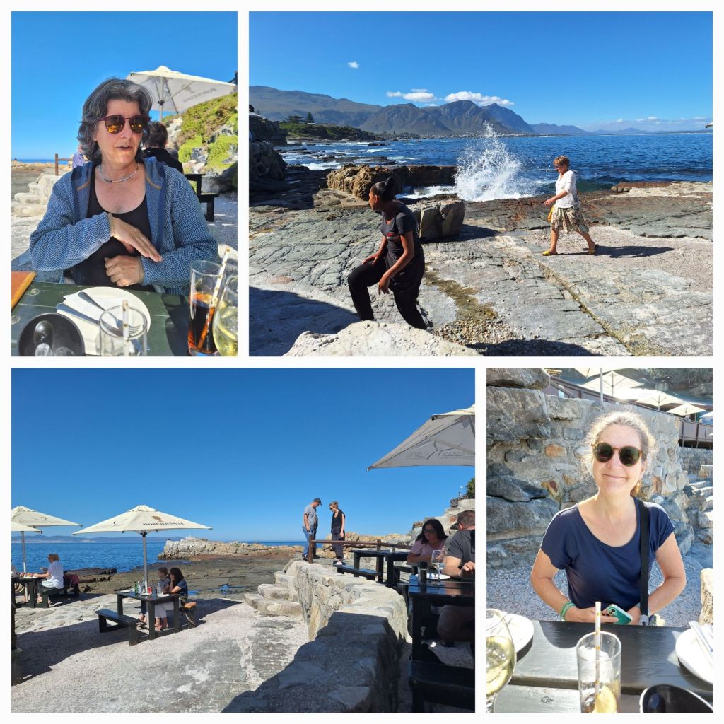 Hermanus wird für uns zwar nicht der Ort zur Walbeobachtung werden, aber die Stadt hat ansonsten auch einiges zu bieten. Zum Mittagessen haben wir ein Restaurant ausgesucht, das nicht schöner gelegen sein könnte. Terrassiert auf verschiedenen Ebenen und sogar auf vorgelagerten Felsplateaus sind die Sitzplätze verstreut. Für das Personal eine echte Herausforderung, für die Gäste der Himmel auf Erden: fantastischer Ausblick, tolle Luft und sagenhaft leckeres Essen – natürlich in erster Linie Fisch.