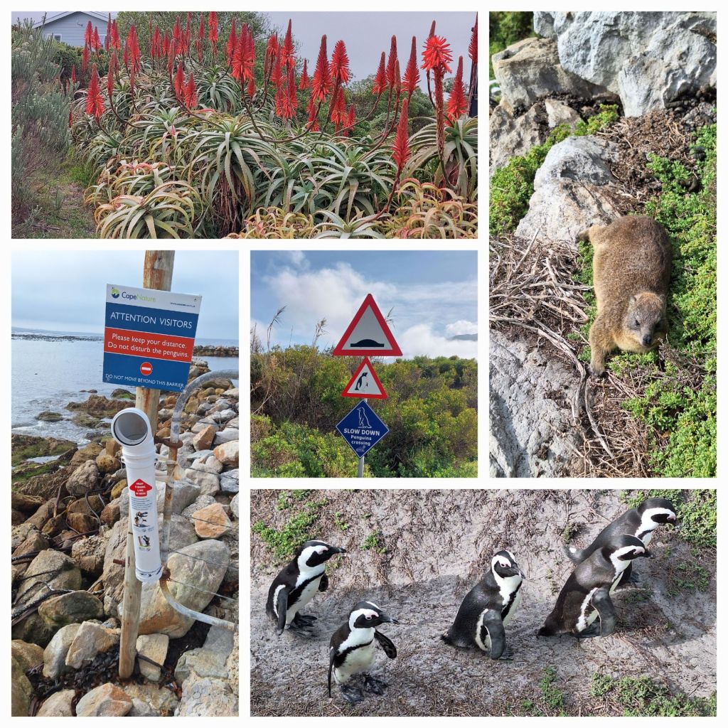 Unsere Tour hierher haben wir in Betty’s Bay unterbrochen, denn dort gibt es einen Strand, an dem man Brillenpinguine beobachten kann. Die Klippen sind mit Laufbohlen versehen, unter denen die Pinguine ungehindert durchwatscheln können und ihrem Tagesgeschäft nachgehen: Höhle putzen, sich selber putzen, schietern (natürlich ausserhalb des Heims!), baden gehen oder sonnenbaden und als Truppe oder einzeln die Gegend erkunden.