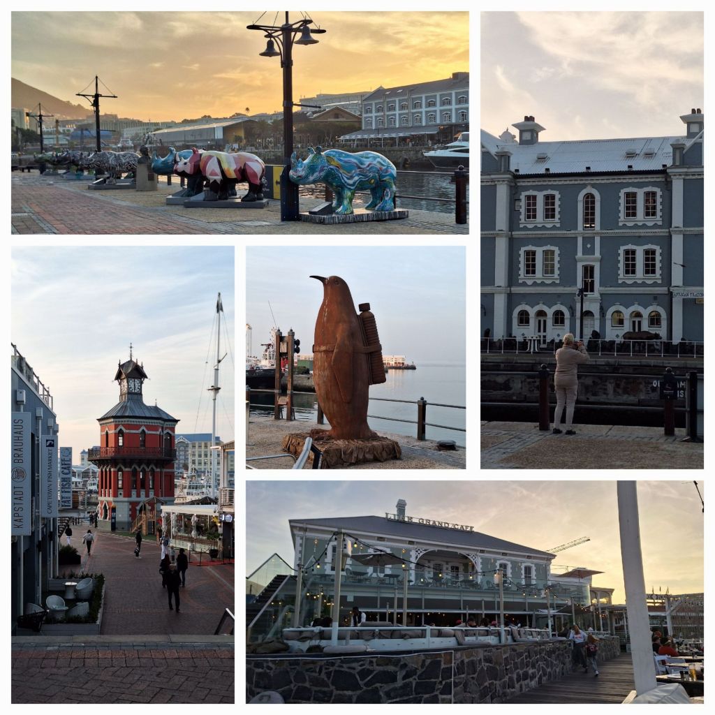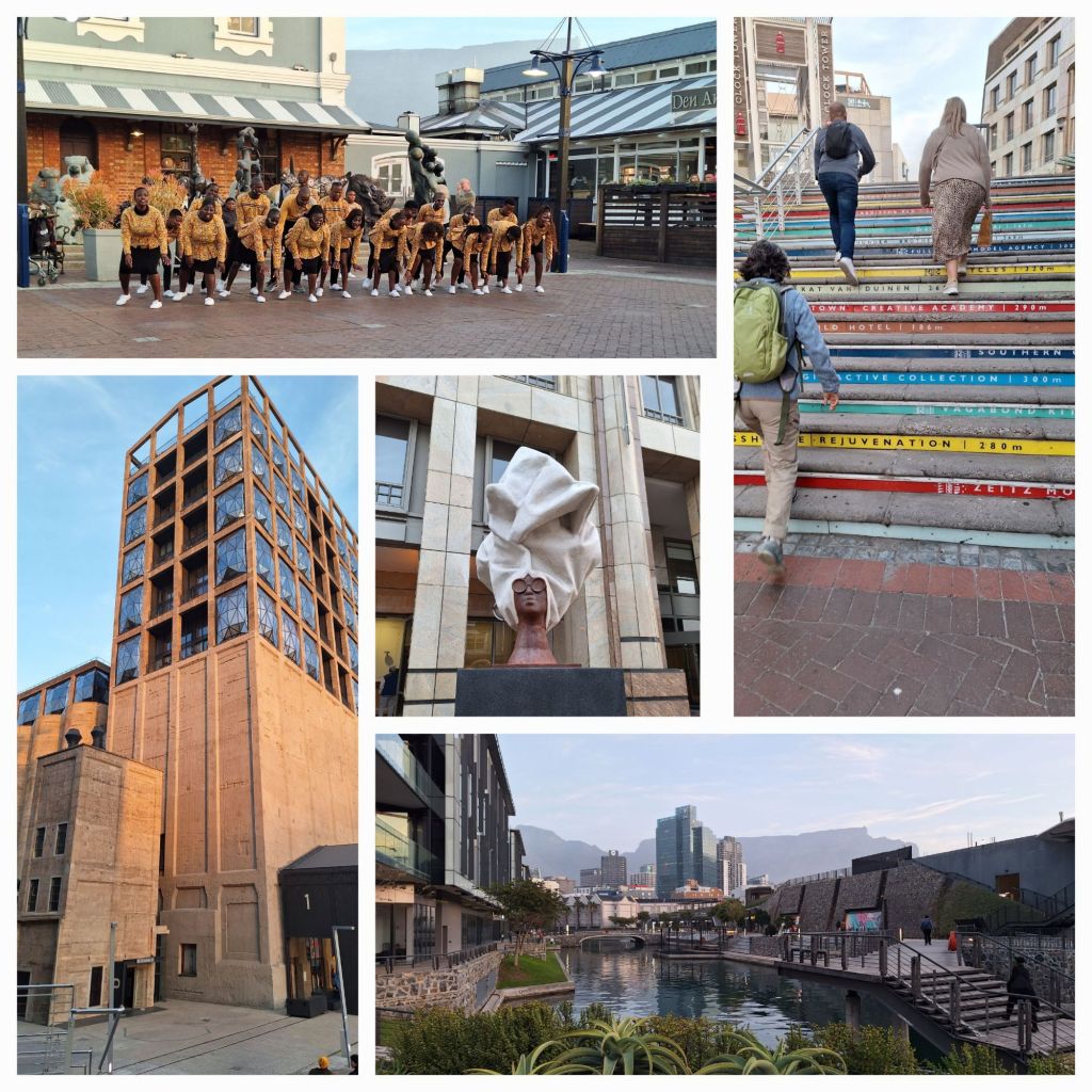 Mächtig was los an der V&A WaterfrontZiemlich beeindruckender Chor (o.l.). Das Zeitz Mocca – moderne Kunst im ehemaligen Getreidespeicher und darüber HotelAbendstimmung mit Uhrturm. Unser Restaurant (u.r.)