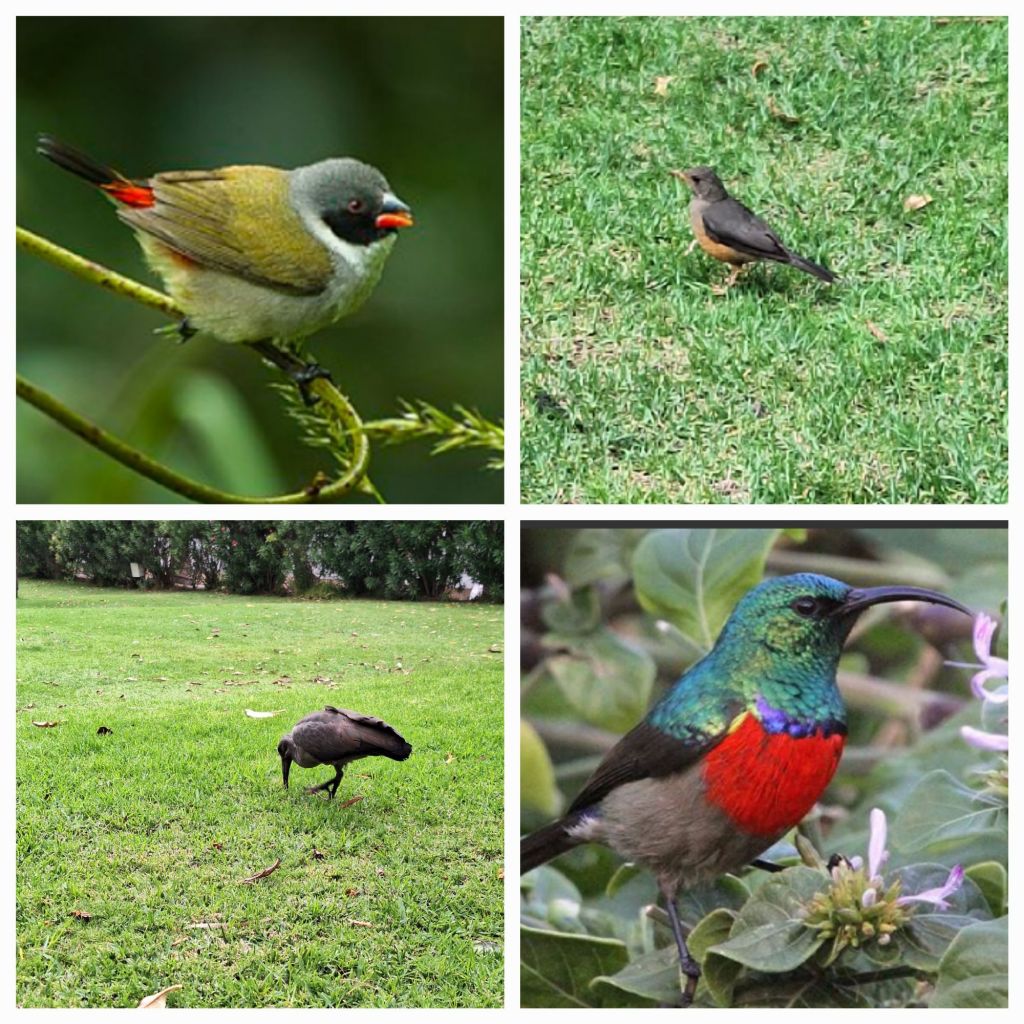 Im Uhrzeigersinn von o.l. Prachtfink, n.n., Hagedasch, Kapnektarvogel.