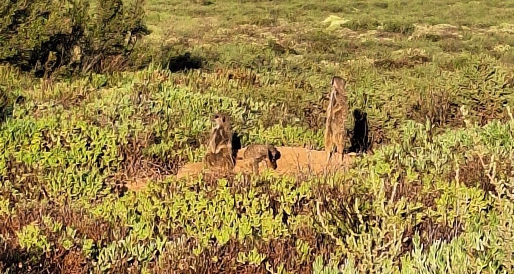 Mitunter dauert so eine Sichtung nicht lange – der Guide berichtete von seiner kürzesten Tour, bei der die Erdmännchen gerade einmal 5 Minuten zum Aufwärmen und zur Klärung der Rangfolge brauchten und danach in der Karoo verschwunden sind.