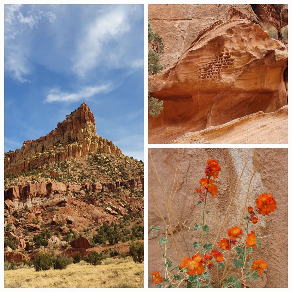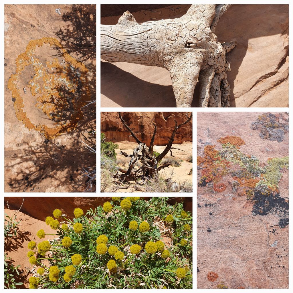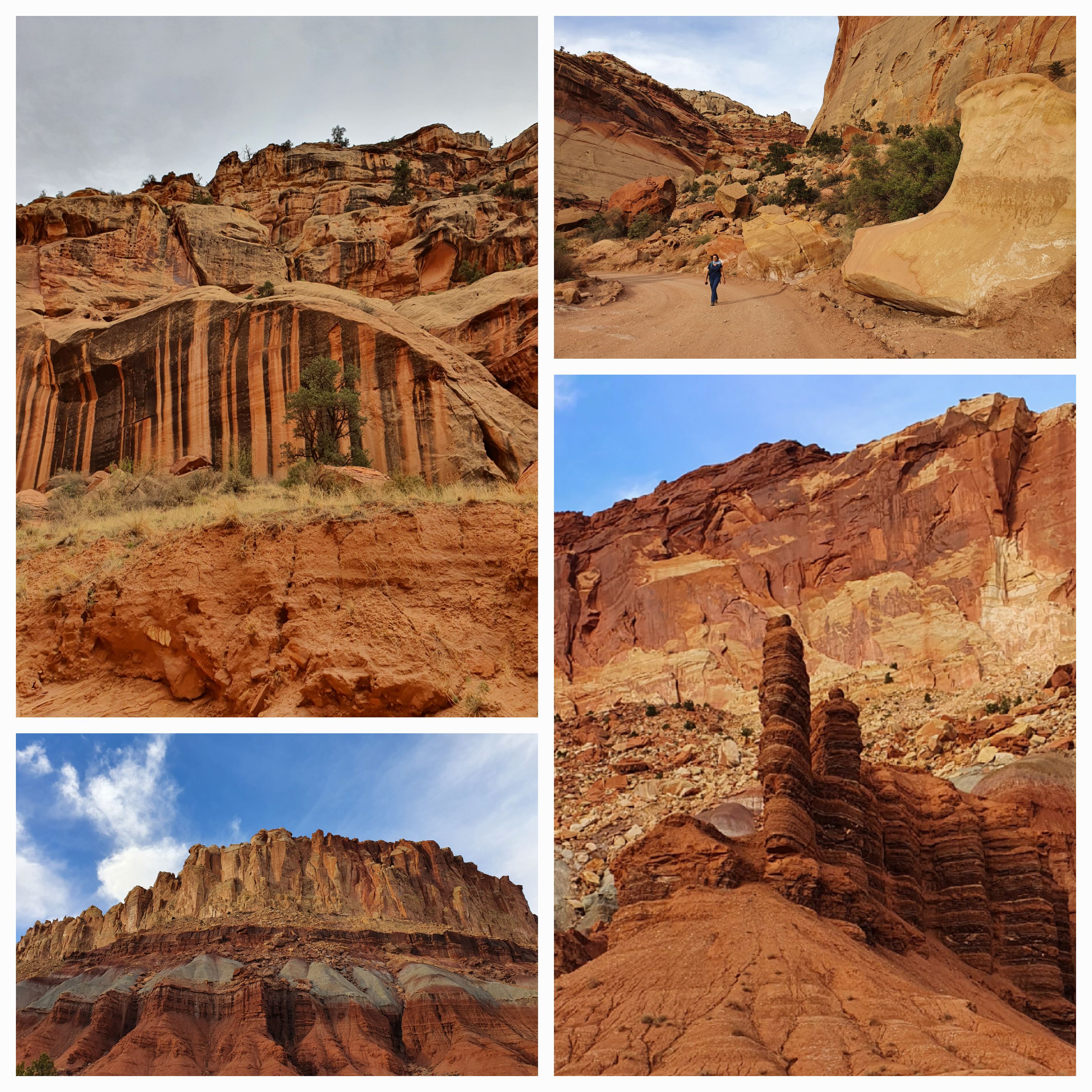 Im Park selbst sind nicht viele Wanderer unterwegs, streckenweise sind wir völlig allein in dieser fantastischen Natur. Zu Beginn der Route geht es steil bergan und wir haben einen tollen Blick auf Fruita, dann geht’s in den Canyon mit doch relativ grossem Baumbewuchs. Die Farben der steil aufragenden Felswände begeistern uns sehr. Nachdem wir inzwischen wissen, wie wichtig die Flechten und Moose für das Ökosystem sind, findem wir diese ‚gelbe Wand‘ besonders schön.