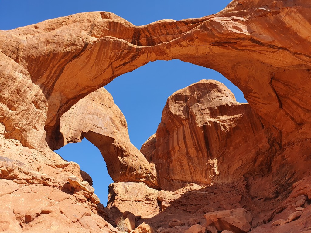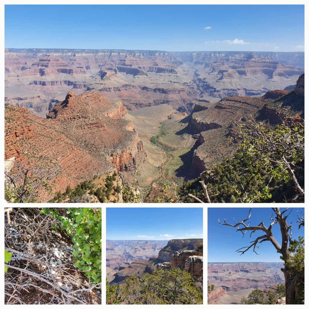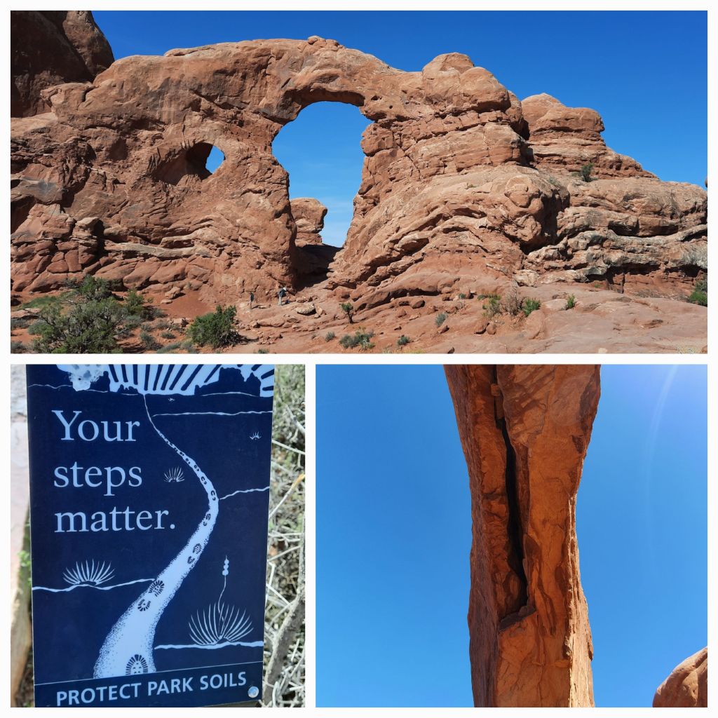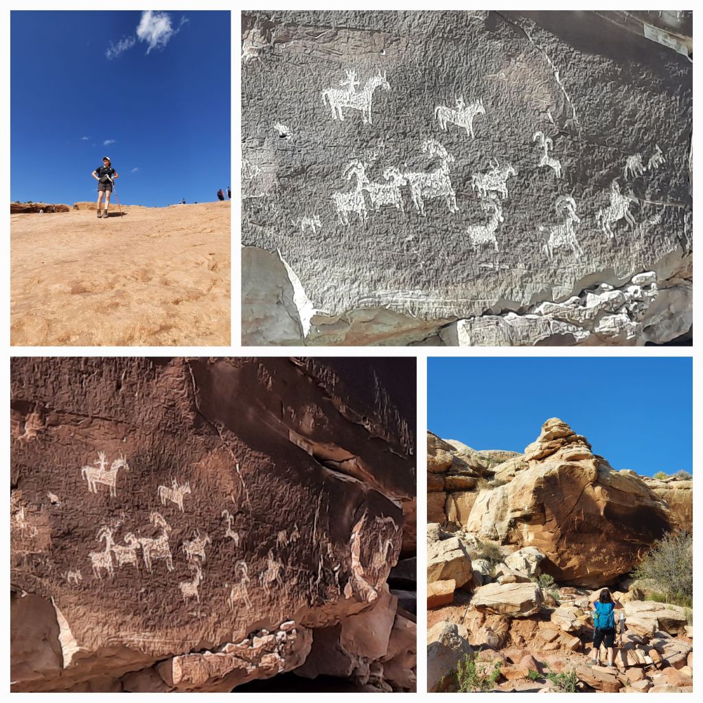 Im Park selbst sind nicht viele Wanderer unterwegs, streckenweise sind wir völlig allein in dieser fantastischen Natur. Zu Beginn der Route geht es steil bergan und wir haben einen tollen Blick auf Fruita, dann geht’s in den Canyon mit doch relativ grossem Baumbewuchs. Die Farben der steil aufragenden Felswände begeistern uns sehr. Nachdem wir inzwischen wissen, wie wichtig die Flechten und Moose für das Ökosystem sind, findem wir diese ‚gelbe Wand‘ besonders schön.